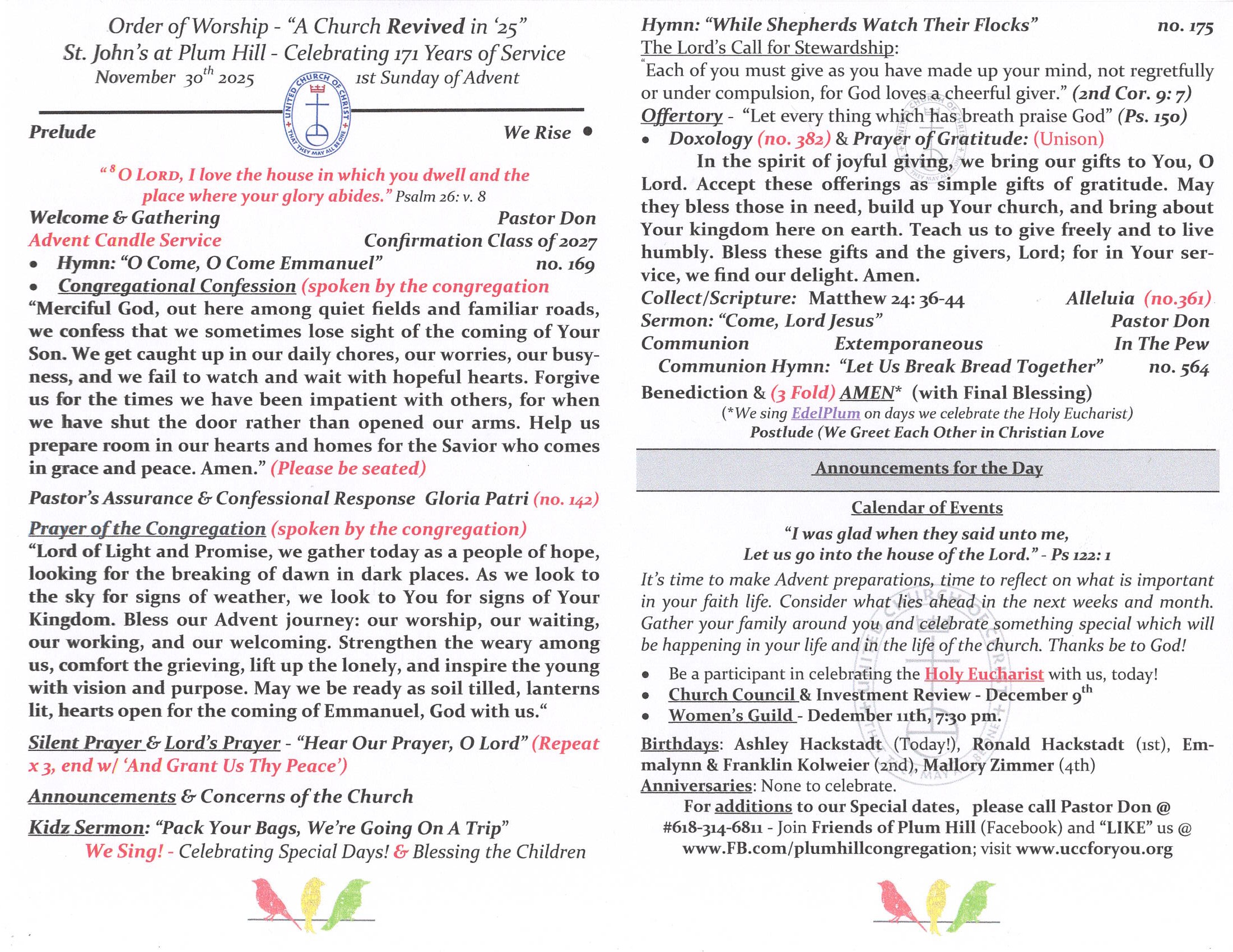 SUNDAY WORSHIP BULLETIN for 11-30-25 - 1st Sunday of Advent