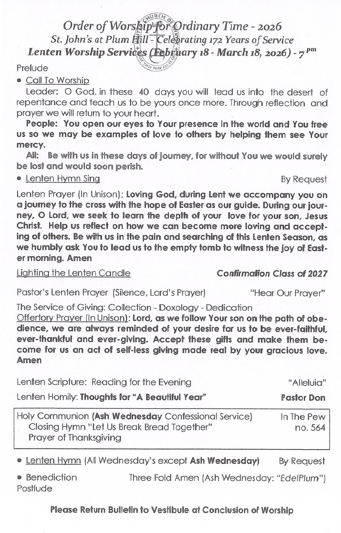 Wednesday night (2-18), we continue the tradition of Mid-week Lenten services at our Plum Hill church. We will conduct a brief vesper service beginning at 7 pm. Our first service is Ash Wednesday, and we will celebrate the Holy Eucharist. Our message is based on the book "A Beautiful Year" written by Diana Butler Bass. These mid-week services continue through March 18, 2026. Please join us in person or via our remote FB feed. PD